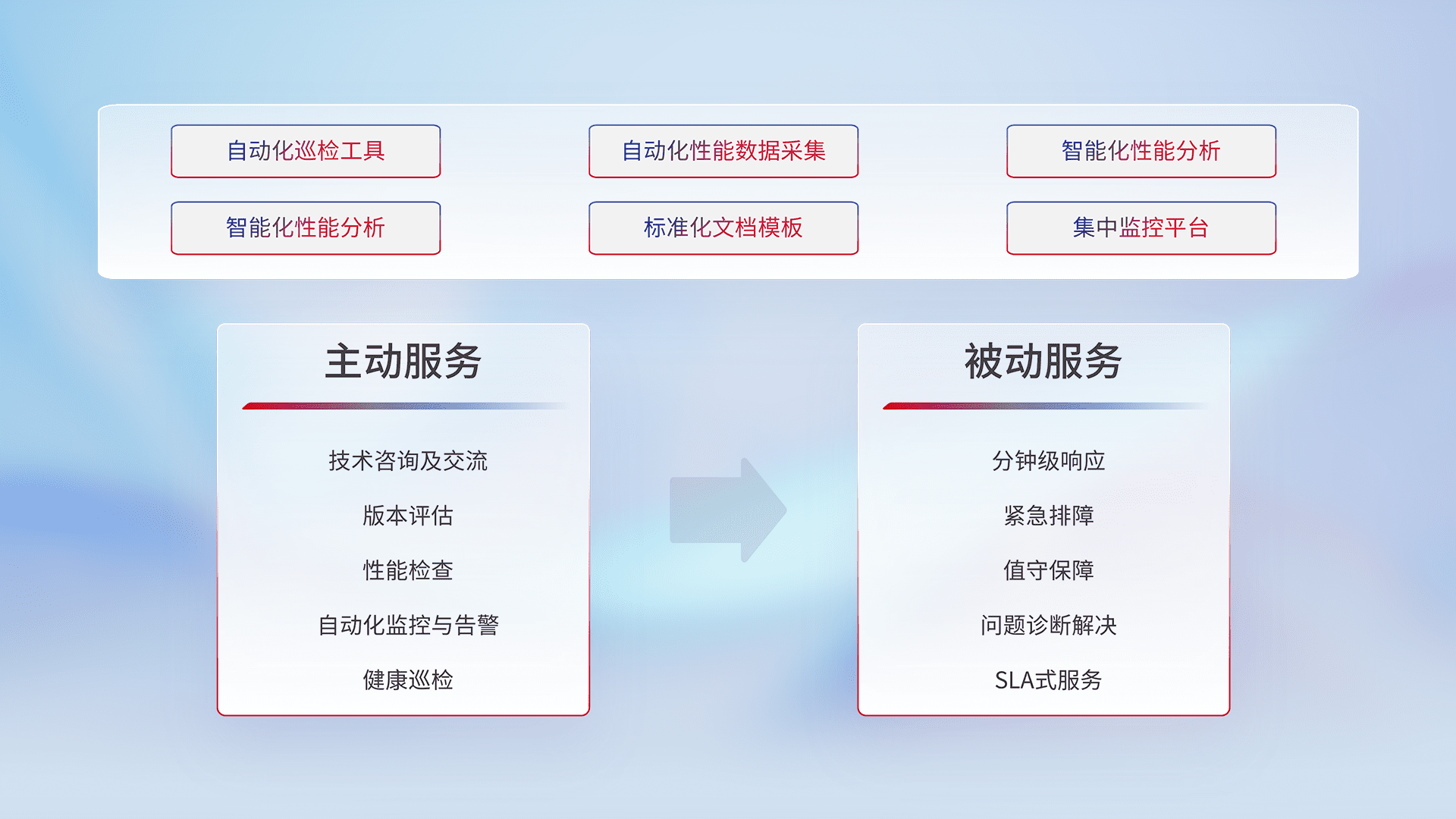 智能化工具和标准化文档,,保障服务质量,,提供主动服务(包含技术咨询、、、、版本评估、、、性能检查、、、自动化监控与告警、、健康巡检)和被动服务包含(分钟级响应、、紧急排障、、值守保障、、问题诊断解决、、、、SLA服务)。。。。